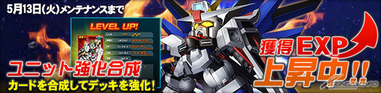 今天起到5月13日(二)止的活動期間中,將舉辦在機體合成時能夠獲得比平常EXP更多的活動。就請趁這個獲得更多EXP的機會,來盡量強化獲得的機體吧。