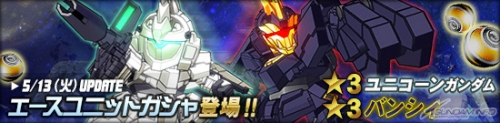 此外,「★3 獨角獸鋼彈」、「★3 報喪女妖」也在王牌機體轉蛋登場。白金駕駛員轉蛋當中則追加了「★3 巴納吉・林克斯」、「★3 瑪莉妲.克魯斯」,請務必去看看。