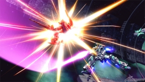 ▲特殊格鬥武裝「精神感應框架的共鳴」會卸下各種武裝,發出使自機周圍敵機麻痺的光芒,同時盾牌會飛出去連射光束格林機槍後,進行撞擊。