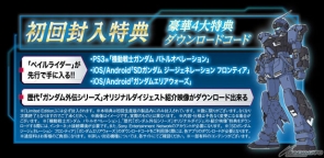 而通常版以及限定版都有的初回封入特典,是能夠在好評提供中 PS3「機動戰士鋼彈 激戰任務」等遊戲上搶先獲得「Pale Rider」的產品序號,共有4大豪華下載特典序號。