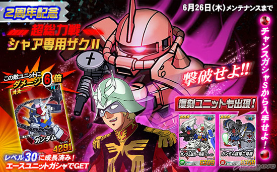 自即日起到6月26日(四)止的限定期間內,「夏亞專用薩克II」將會在超總力戰中登場,在這段期間中進行任務時,將有機會跟「夏亞專用薩克II」交戰。