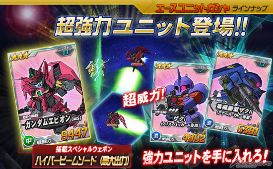 從今天起在王牌機體轉蛋中,除了有「★3 次代鋼彈(MS)」、「★3 高機動型薩克II(阿納貝爾‧卡多專用)」、「★3 薩克I(諾里斯‧帕卡德專用)」等機體登場外,在白金駕駛員轉蛋中還有「★3 諾里斯‧帕卡德」、「★3 阿納貝爾‧卡多」、「★3 米利亞爾特‧匹斯克拉福特」等駕駛員登場。這部分也請一併確認。