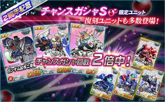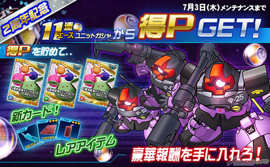 除了在王牌機體轉蛋中追加了「★3 次代鋼彈(MS)」、白金駕駛員轉蛋追加了「★3 諾里斯‧帕卡德」等卡片外,還開始舉辦紀念2周年的「2週連續 得P活動」。