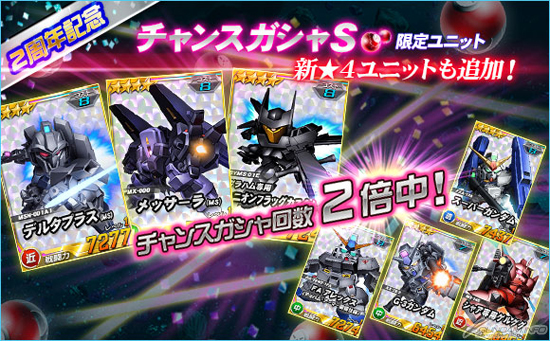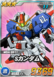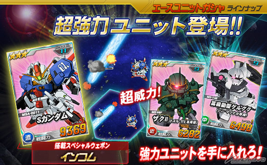今天起在王牌機體轉蛋中除了有「★3 S鋼彈」、「★3 薩克II(德茲爾・薩比專用機)」、「★3 高機動型傑爾古格(松永・真專用)」登場外,白金駕駛員轉蛋中還有「★3 遼・魯茲」、「★3 德茲爾・薩比」、「★3 松永・真」等人登場。「★3 S鋼彈」是搭載特殊武裝「導引砲」的強力機體,別忘了來確認一下這台機體喔。
