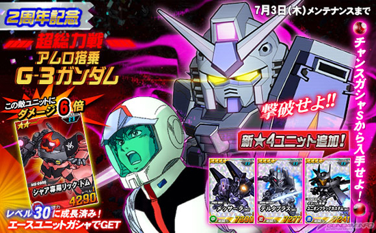 即日起到7月3日(四)止的限定期間內,「阿姆羅駕駛的G-3鋼彈」將會在抄總力戰中登場,活動期間中進行任務時,有機會跟「阿姆羅駕駛的G-3鋼彈」交戰。