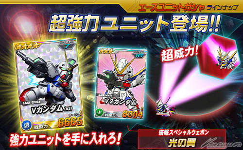 而今天起在王牌機體轉蛋中,新增了「「★4 V鋼彈(MS)」、「★3 V2鋼彈」、「★3 孔提歐」等機體;「V2鋼彈」是裝備了特別武裝「光之翼」的強力機體。白金駕駛員轉蛋也追加了「★3 胡索.艾溫」、「★3 庫羅諾克.阿瑟」等角色。別忘記要一併作個確認喔!