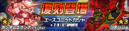 除此之外,王牌機體轉蛋也追加了「★3 能天使鋼彈(TRANS-AM)」、「★3 新安州」等復刻機體,而「鋼彈鬥技場」和「獲得PP增量活動」、「登入獎勵活動」也同時舉辦中。