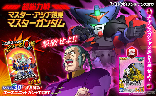 次的超總力戰中,「亞洲天王搭乘的天王鋼彈」將會登場。活動期間到7月31日(四)止,這段期間進行任務時將有機會跟「亞洲天王搭乘的天王鋼彈」交戰。
