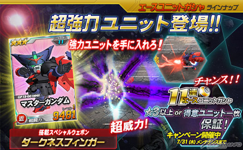 此外,王牌機體轉蛋也追加了「★3 天王鋼彈」,白金駕駛員轉蛋中則追加「★3 東方不敗亞洲天王」;「11連轉蛋保證1張★3以上or得意機體活動」和「海洋之日轉蛋活動」也在今天起開始舉辦。