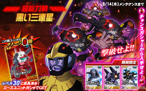 打倒「黑色三連星」就可以抽機會轉蛋S,除了有機會獲得★3 強化專用哈囉(合成機體)」外,「★4 德爾塔普拉斯(MS)」、「★4 梅薩拉(MS)」、「★4 葛拉漢專用旗幟式特裝型(MS)」等機體也會在限定期間內再次推出。而王牌機體轉蛋中還追加了「★2 鋼加農」,這台機體對上「黑色三連星」可以發揮6倍的攻擊力。