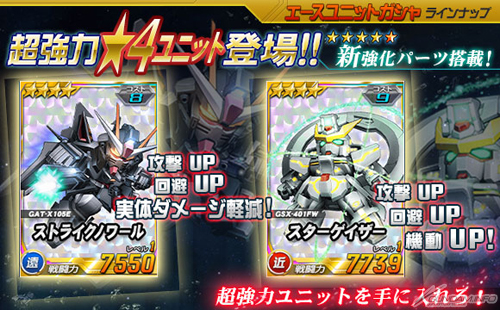 除此之外,王牌機體轉蛋也追加了「★4 觀星者」和「★4 漆黑攻擊鋼彈」,而白金駕駛員轉蛋則追加了「★3 史溫.卡爾.巴揚」。而「任務獲得GP提升期間」也從今天起開始。