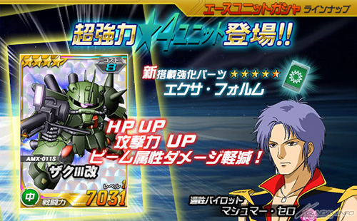 而今天起在王牌機體轉蛋中,新增了「★4 薩克III改」、「★3 加邦專用伯爾加諾」等機體;「★4 薩克III改」是裝備了強化零件「EXA Forme」的強力機體,務必來將這台機體拿到手吧!