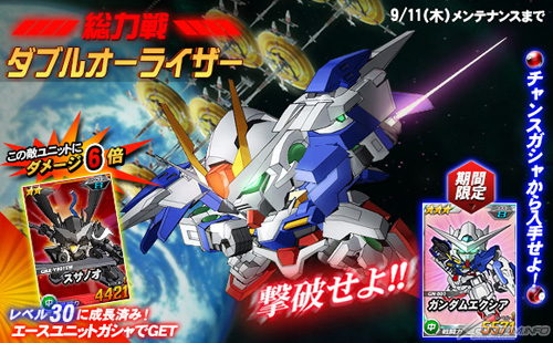 打倒「00強化模組」就可以抽機會轉蛋,除了有機會獲得「★3 能天使鋼彈」外,王牌機體轉蛋中還追加了「★2 須佐之男」,這台機體對上「00強化模組」可以發揮6倍的攻擊力。