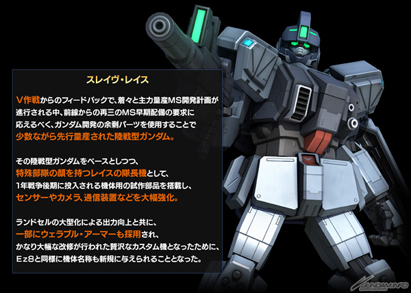 以陸戰型鋼彈為本改造的「Slave Wraith」,是在一年戰爭後期投入的機體,搭載許多試作的裝備強化了偵查和攝影機、通訊裝置等等,是一台做了大幅改裝而獲得新機體名、堪稱奢侈的改裝機。