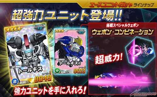 除此之外,王牌機體轉蛋也追加了「★4 托爾吉斯」、「★3托爾吉斯II」等機體;白金駕駛員轉蛋中則追加了「★3 特列斯・克休里納達」。此外,「機體合成經驗值提升期間」也從今天開跑。