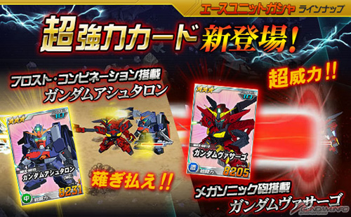 而今天起在王牌機體轉蛋中,新增了「★3 阿斯特龍鋼彈(MS)」、「★3 瓦沙可鋼彈」等機體;「★3 阿斯特龍鋼彈(MS)」裝備了特別武裝「佛羅斯特連段攻擊」,「★3 瓦沙可鋼彈」則裝備了特別武裝「MEGA音速砲」,兩台都是強力機體,非拿不可!