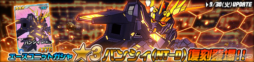 除此之外,王牌機體轉蛋也追加了「★3 報喪女妖(NT-D)」,而白金駕駛員轉蛋中則追加了「★3 希洛・唯」等多位強力駕駛員;而「鋼彈鬥技場」和「獲得PP增量活動」也同時舉辦中,「登入獎勵」的獎勵內容也更新了。