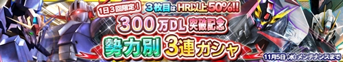「勢力別3連轉蛋」是以過去登場的人氣機體、駕駛員、支援為中心所構成的3連轉蛋,第3張出現HR以上卡片的機率高達50%。