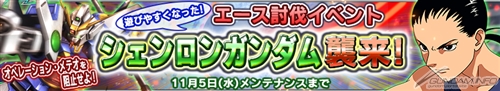 到11 月5日(三)維修開始前的活動期間內,在戰爭或是每日任務的搜索點,將會出現活動限定王牌,討伐這位王牌累積擊破點數,就能獲得「HR 張五飛」、「SR 神龍鋼彈」等活動機體和駕駛員。