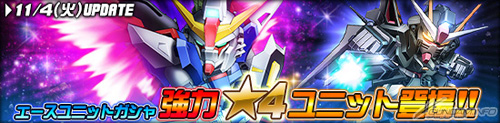 而在王牌機體轉蛋中,則新增了「「★4 命運鋼彈」、「★4 漆黑攻擊鋼彈」、「★3瞬發型薩克幽靈(雷専用機)」、「★3 基恩改(伊萊傑専用機)」、「★3 達基・伊爾斯(白)」、「★3 量産型鋼加農(白色獵犬樣式)」等機體。在這些機體中,「★4 命運鋼彈」裝備了強化零件「Hyper Duetrion引擎」,「★4 漆黑攻擊鋼彈」則裝備了「攻擊背包系統(N)」,都是非常強力的機體,一定要把這兩台機體拿到手喔!