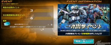 「一舉出撃活動」是只要活動期間內參加大規模戰,就可依照戰果獲得「出撃點數」,累積越多點數就可以拿到越豪華的報酬。盡量出擊來拿更多報酬吧!