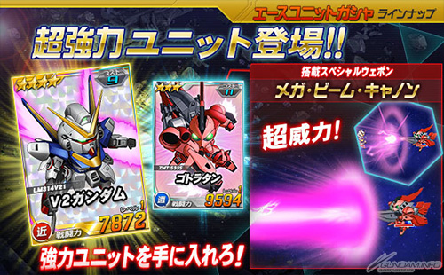 而今天起在王牌機體轉蛋中,新增了「★4 V2鋼彈」、「★3 葛拉坦」、「★3 洛特(MS)」等機體;「★4 V2鋼彈」裝備了強化零件「米諾夫斯基粒子動力裝置」,「★3 葛拉坦」則裝備了特殊武器「MEGA光束巨砲」,兩台機體都是牆力機體,一定要來拿喔!
