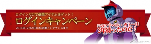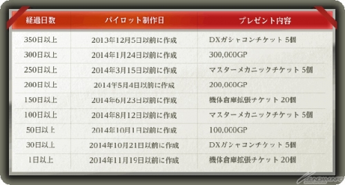 以2014年11月19日的定期維修前作成登記的駕駛員為對象,將贈送豪華道具。由於駕駛員登記的時間越久就能獲得越多的道句,已經離開戰線一段時間的駕駛員,務必趁著此機會回來遊戲吧!