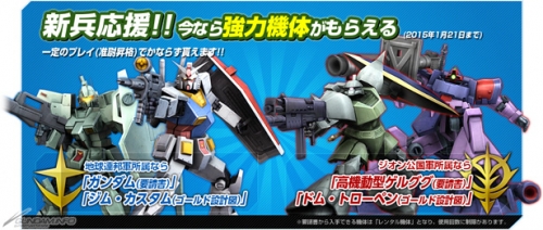 即日起開始的「新兵募集活動」是,只要在活動期間内升格為「准尉」,就能獲得可開發強力機體的「黃金設計圖」,以即可租用機體的「要請書」。