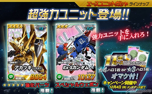 自今天起,「★4 曉(不知火)」和「★3 Ex-S鋼彈」在王牌機體轉蛋中登場。「★4 曉(不知火)」裝備了強化零件「八咫鏡」,「★3 Ex-S鋼彈」則裝備了特殊武裝「反射式導引砲」,這兩台都是強力機體,一定要拿到手喔!