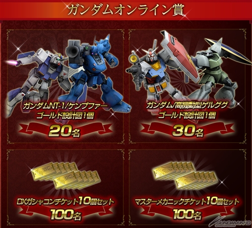 以前登場過的人氣機體「鋼彈NT-1」和「肯普法」的黃金設計圖,各有20個名額;「鋼彈」和「高機動型傑爾古格」的黃金設計圖,各有 30個名額。另外還有「DX轉蛋票10張套組」和「機械大師票10張套組」,將各送出100個名額。