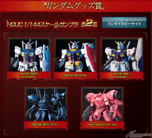 獎品有「鋼彈NT-1」及「鋼彈」等機體的黃金設計圖、「DX轉蛋票10張套組」、HGUC系列的鋼彈模型,還有以『機動戰士鋼彈』為設計概念的服飾品牌「STRICT-G」的商品等多項大獎。