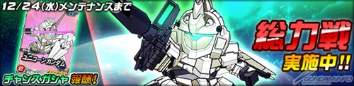 本次總力戰的活動期間到12月9日(二)止,而「獨角獸鋼彈」將會在這次的總力戰中登場。在這段期間內進行任務時,將有機會跟「獨角獸鋼彈」交戰。
