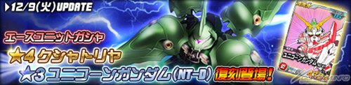本次在王牌機體轉蛋中,新增了「★4 剎帝利」和「★3 獨角獸鋼彈(NT-D)」等多台強力機體。