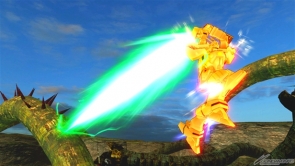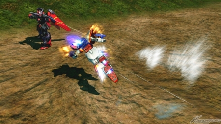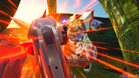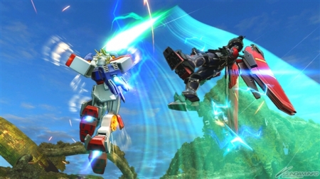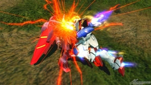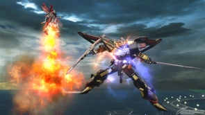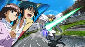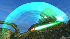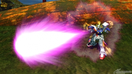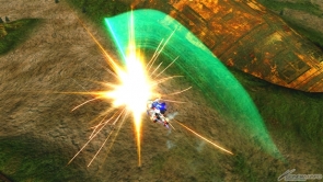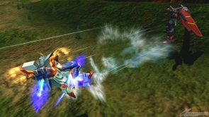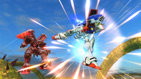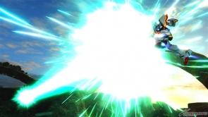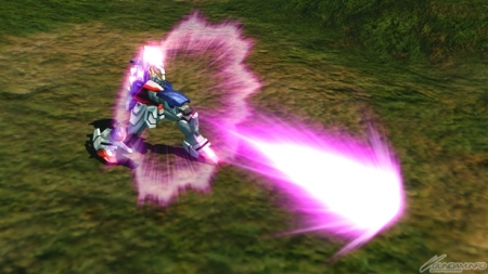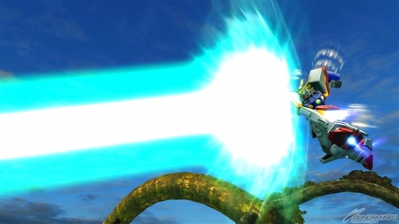 ▲特殊射擊武器「呼叫古龍鋼彈」,根據搖桿輸入方向不同,呼叫出來的古龍鋼彈會進行不同的攻擊。搖桿不動時,呼叫出來的古龍鋼彈會發動超級霸王電影彈,然後由閃光鋼彈擊出。成功擊出的時候,會增加超級霸王電影彈的速度和追蹤性能。在搖桿有動作的狀況下呼叫古龍鋼彈,則會發動古龍連擊。