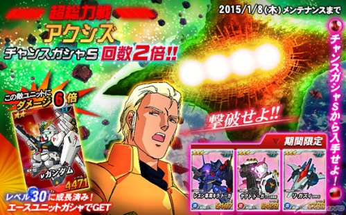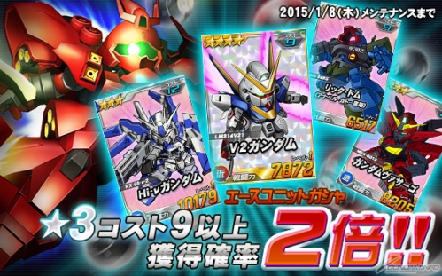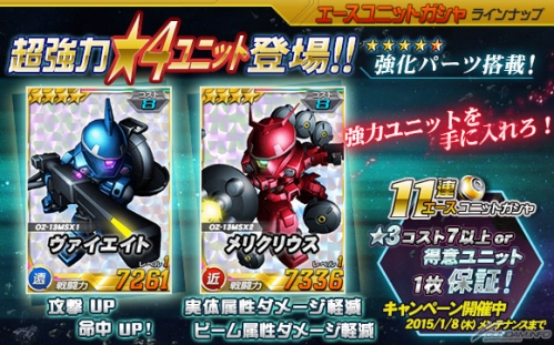 2015年1月8日(四)維修開始前期間限定的「★3 COST9以上獲得機率2倍活動」,和「11連轉蛋☆3 COST 9以上 or 特效機體保證活動」同時開跑了。請一定要趁著這個機會來遊玩本遊戲。