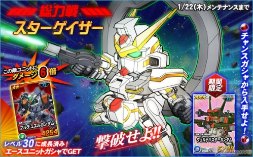打倒「觀星者」就可以抽機會轉蛋,除了有機會獲得「★3 翠綠暴風鋼彈」外,王牌機體轉蛋中還追加了「★2 蔚藍決鬥鋼彈」,這台機體對上「觀星者」可以發揮6倍的攻擊力。