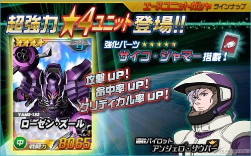 今天起在王牌機體轉蛋中,新增了「「★4 羅森・祖魯」、「★3 傑斯塔(乘坐噴射座)」等機體。「★4 羅森・祖魯」是裝備了強化零件「精神感應妨礙裝置」的強力機體,一定要來拿!而白金駕駛員轉蛋也追加了「★3 安傑洛.梭裴」和「★3 奈吉爾‧葛瑞特」等角色。
