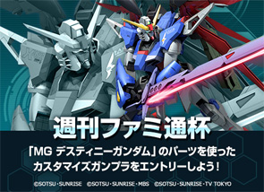 「MG 骷髏鋼彈X1」將可透過今天1月15日(四)發售的「電擊PlayStation Vol.582」內附產品序號來下載,「MG 命運鋼彈」則同樣可由今天發售的「週刊法米通2015年1月29日號」內附產品序號來領取;玩「鋼彈破壞者 2」的遊戲時也能夠撿到這些零件。而只要報名參賽,就可獲贈能在「鋼彈破壞者2」遊戲内使用的道具,一定要來參加喔!