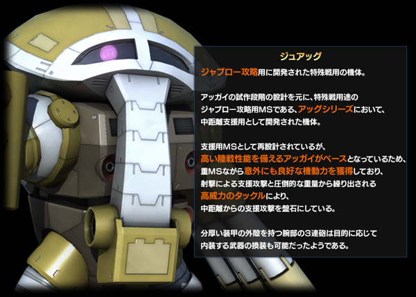 「裘亞克」是以亞凱的試作階段設計為本,為了賈布羅攻略而開發的中距離支援用機體。雖然是作為支援用MS重新設計的機體,但因為是以有著優秀陸戰性能的亞凱為本,所以雖然是重型 MS但機動力卻很好。