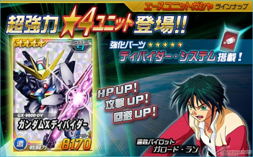 今天起在王牌機體轉蛋中,新增了「★4 鋼彈X Divider」、「★3空中霸王鋼彈」等機體。「★4鋼彈X Divider」是裝備了強化零件「Divider系統」的強力機體,一定要拿到手!