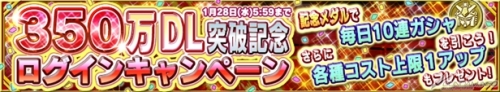 依照在活動期間內登入遊戲的天數,可獲得每天能夠轉1次的10連轉蛋「DL次數突破350萬紀念代幣」和「各種COST上限加1」等好禮。