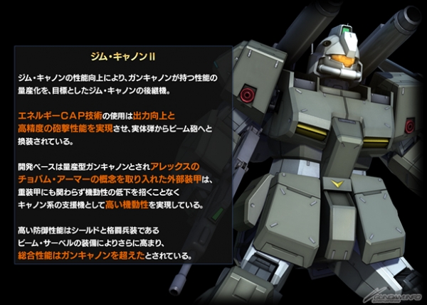 「吉姆加農II」是目標量產擁有鋼加農性能的吉姆加農後繼機。使用能源CAP技術,得以實現出力的提高和高精度的砲擊性能,從實體彈換裝成光束砲。開發基礎是量產型鋼加農,藉由取自亞雷克斯複合裝甲概念的外部裝甲,實現了加農系作為支援機的高機動性。綜合性能被認為超越了鋼加農。