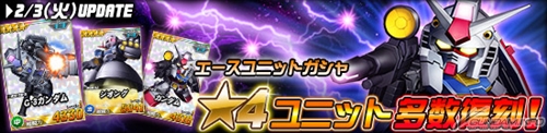 「★4 鋼彈」與「★4 吉翁克」等強力機體會在王牌機體轉蛋中登場,白金駕駛員轉蛋則是會有「★3傑特•亞希達」和「★3 飛鳥真」等人登場,還同時開始「鋼彈戰鬥競技場」和「獲得PP增量活動」。