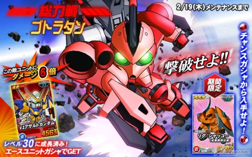 打倒「葛拉坦」的時候可以抽機會轉蛋,除了有機會獲得「★3 里格‧夏柯(近衛師團樣式)」等等以外,在王牌機體轉蛋中追加可以對「葛拉坦」發揮6倍攻擊力的「★2 V2鋼彈突擊型」。
