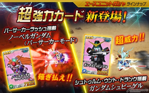 今天起在王牌機體轉蛋中,「★3 諾貝爾鋼彈(狂戰士模式)」、「★3 明鏡鋼彈」等等機體登場。特別武裝部分,「★3 諾貝爾鋼彈(狂戰士模式)」是搭載「狂戰士衝刺」的強力機體,而「★3 明鏡鋼彈」是搭載「狂飆醉」的強力機體,請一定要獲得。