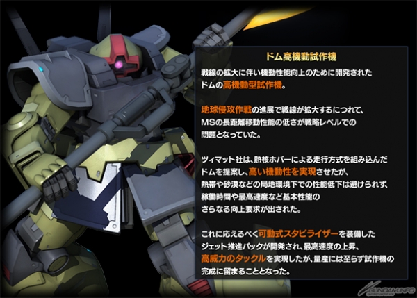 「德姆高機動試作機」是,為了在局地環境下也可以發揮高性能,裝備了具有新開發的可動式穩定器的噴射推進背包,實現了最高速度上昇,高威力的攔截用機體。