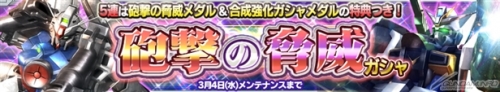 「SR 鋼彈試作3號機史提蒙」、「SR 轟擊型脈衝鋼彈」、「SR 露.魯卡」、「SR 志保.哈尼夫斯」等等追加12張新卡片的轉蛋。5連轉蛋除了會提高HR出現率到9%以外,特典是附屬1~3枚「砲擊的威脅硬幣」。使用「砲擊的威脅硬幣」10枚,就可以使用HR以上確定的「砲擊的威脅硬幣轉蛋」。