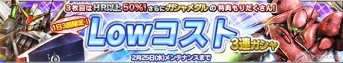 COST7、COST8機體卡片為中心構成的轉蛋。第3張是HR以上的出現率是50%。且附屬「合成強化轉蛋硬幣×3枚」、「EX轉蛋硬幣×3枚」、「勢力轉蛋硬幣×3枚」等特典。1天限定利用3次。