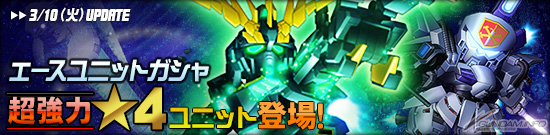 王牌機體轉蛋中,「★4 報喪女妖(覺醒)」、「★4 比基納‧基娜」、「★3 能天使鋼彈修補版II」登場。強化零件部分,「★4 報喪女妖(覺醒)」搭載「精神感應框架」、「★4 比基納‧基娜」搭載「翼狀推進器」,都是超級強力的機體,請一定要獲得。