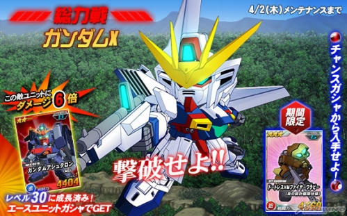 總力戰到4月2日(四)為止的限定期間內有「鋼彈X」登場,活動期間中,進行任務的時候,有機會遭遇「鋼彈X」。